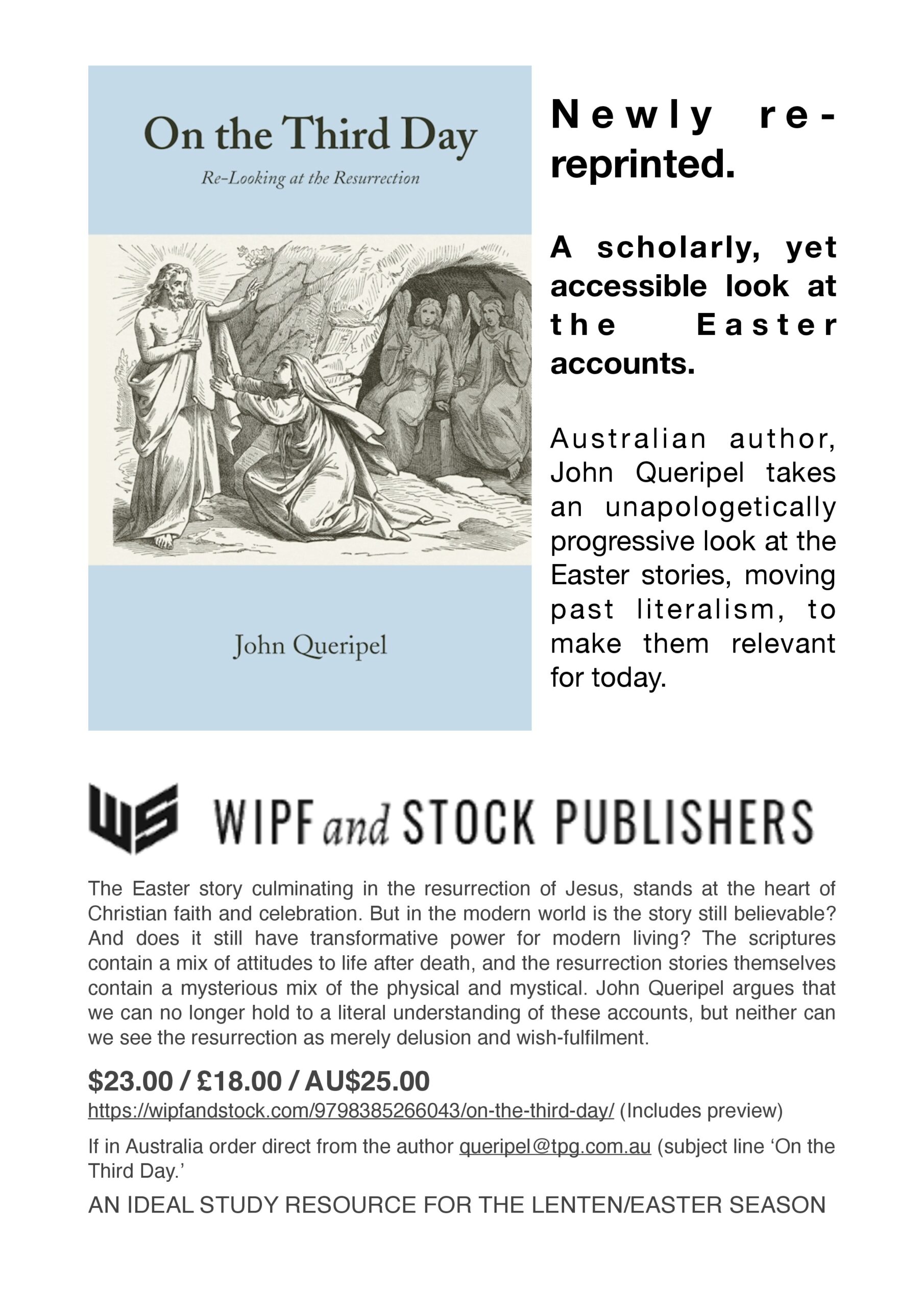 John Queripel has advised his Easter book “On the Third Day” has been re-released onto the international market. And… I thought I would also plug my latest release locally in Melbourne last year, “Dancing with Dandelions”, from Coventry Press. (Check their web site. They will also post internationally).